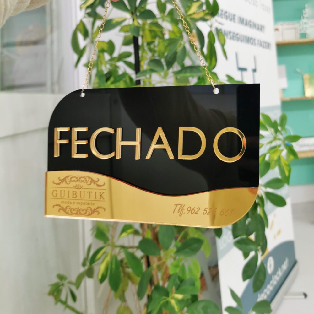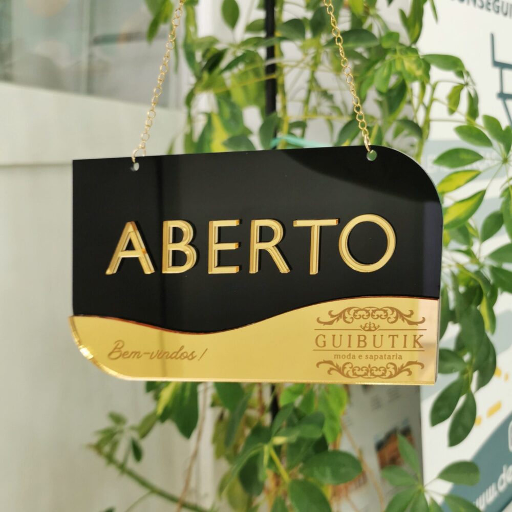 Visual profissional: Com as palavras “ABERTO” e “FECHADO” em destaque em relevo, garante uma comunicação clara para seus clientes, com um toque de sofisticação.