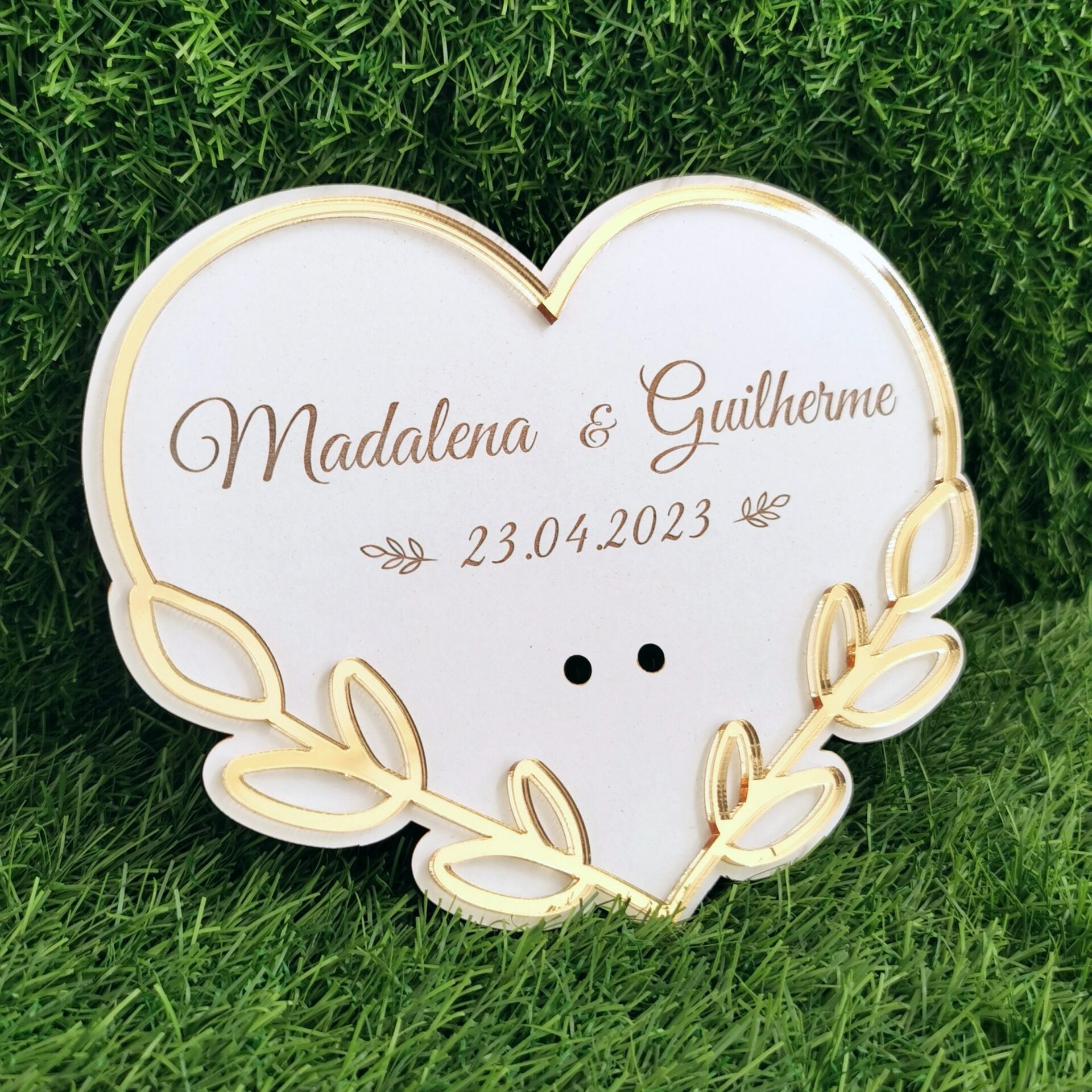 A gravação dos nomes dos noivos e a data do casamento adiciona um toque pessoal e memorável a este artigo, tornando-o um belo lembrete da ocasião especial.